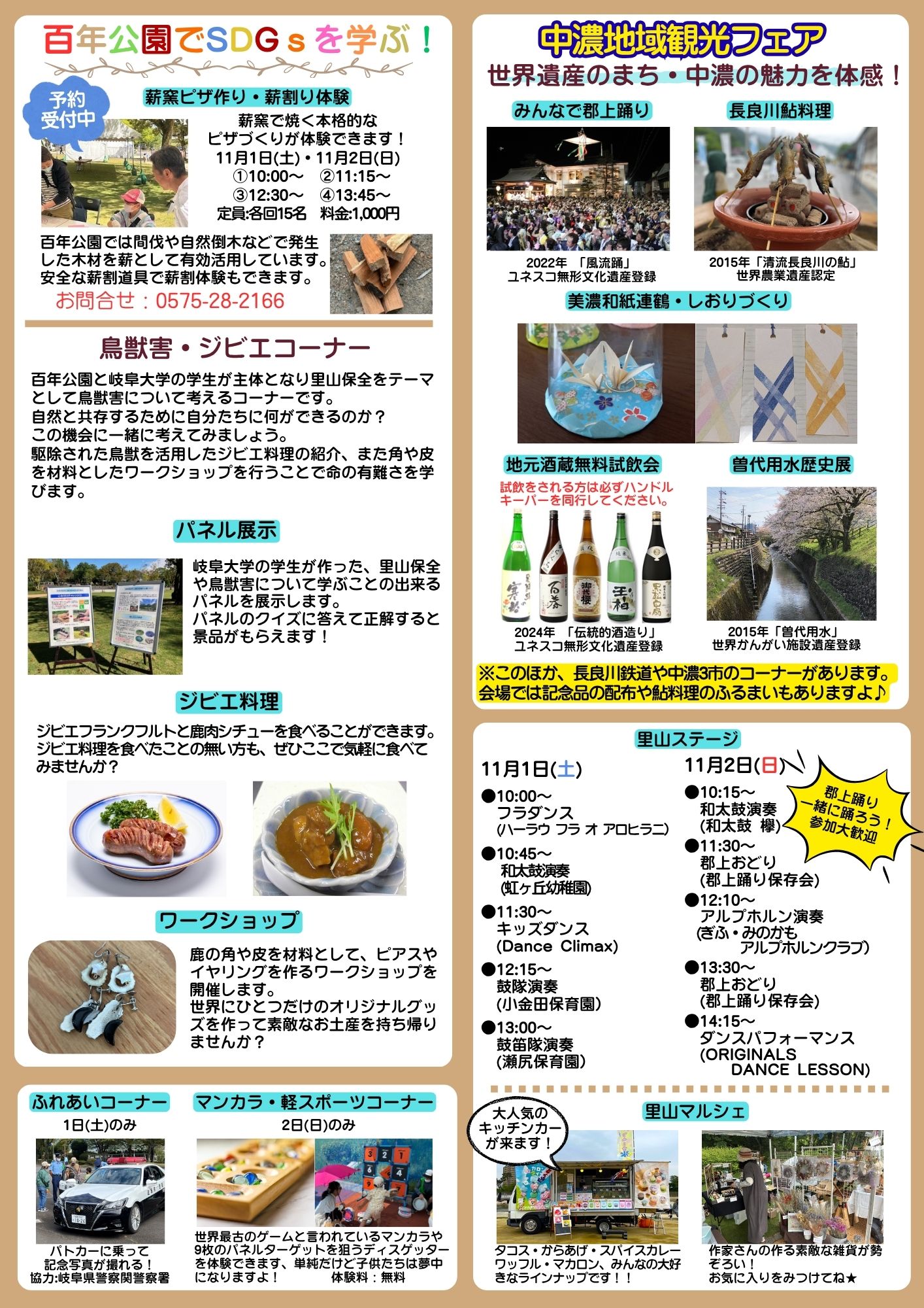 キッズダンスやフラダンス、郡上踊りなどがある里山ステージ。ウッドバーニングやペーパービーズブレスレット作り等が体験できる